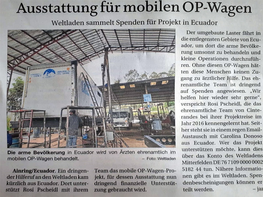 CINTERANDES will receive support from Germany, for the project of its new mobile operating room, thanks to Welt-Laden Fair Miteinander, an incredible organization of approximately 18 women, who sell products from local farmers at a fair price, allowing them to have the funds to survive and guarantee a good education for their children. They also carry out projects to help Artisans in developing countries. For more information about their work, you can visit: www.weltladen-mitterfelden.jimdo.com